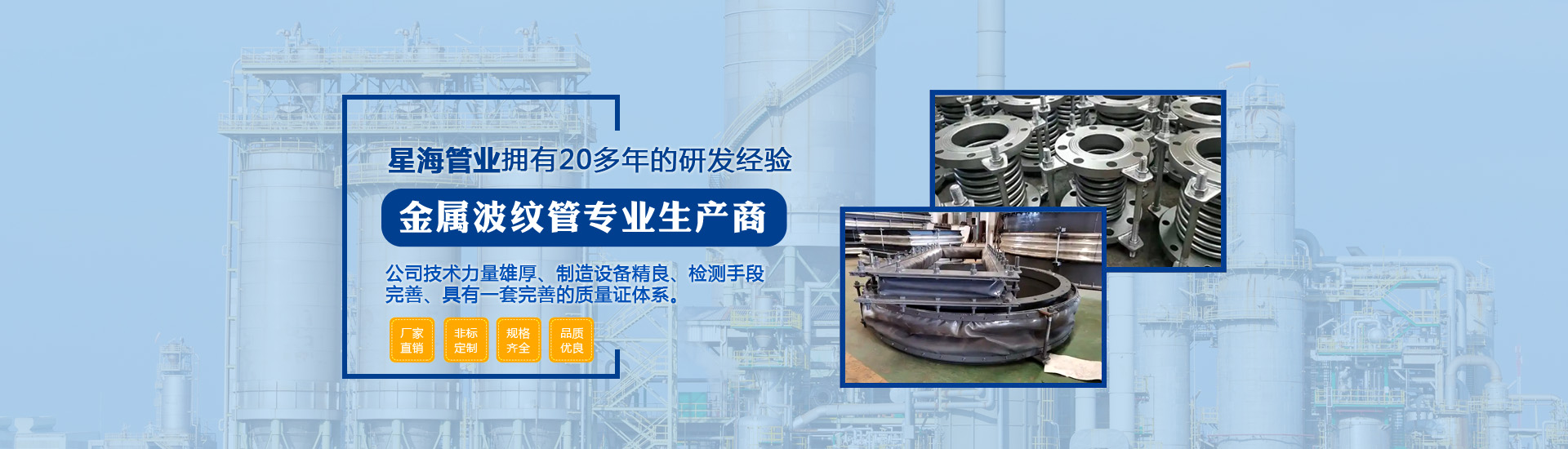 泰州市星海管業(yè)有限公司座落于風景如畫的江蘇魚米之鄉(xiāng),是一家專業(yè)生產金屬波紋管的高新企業(yè)。本公司技術力量雄厚、制造設備精良、檢測手段完善、具有一套完善的質量證體系,系列產品齊全、質量可靠、價格合理,深受廣大用戶的信賴和好評。主導產品是金屬波紋膨脹節(jié),不銹鋼金屬軟管,滑動式伸縮節(jié),填料函式伸縮節(jié),橡膠補償接頭,各種型號彈性吊架...